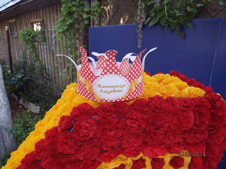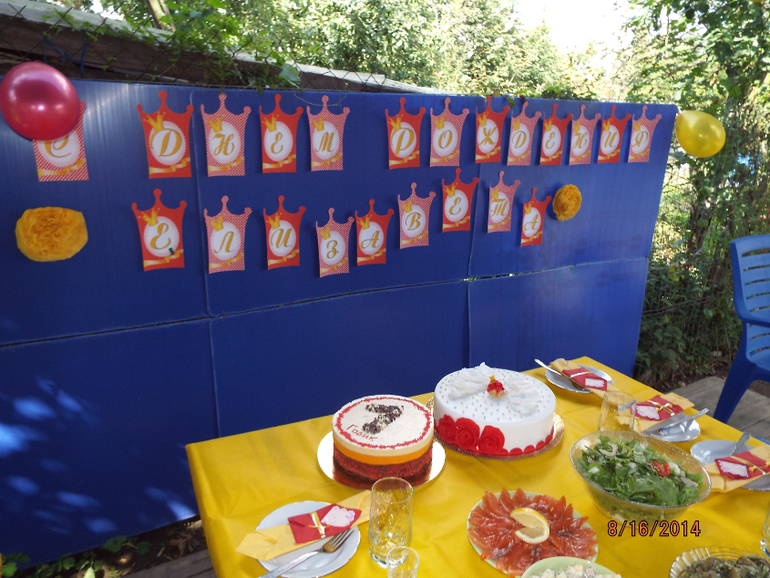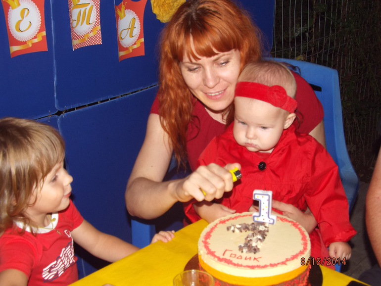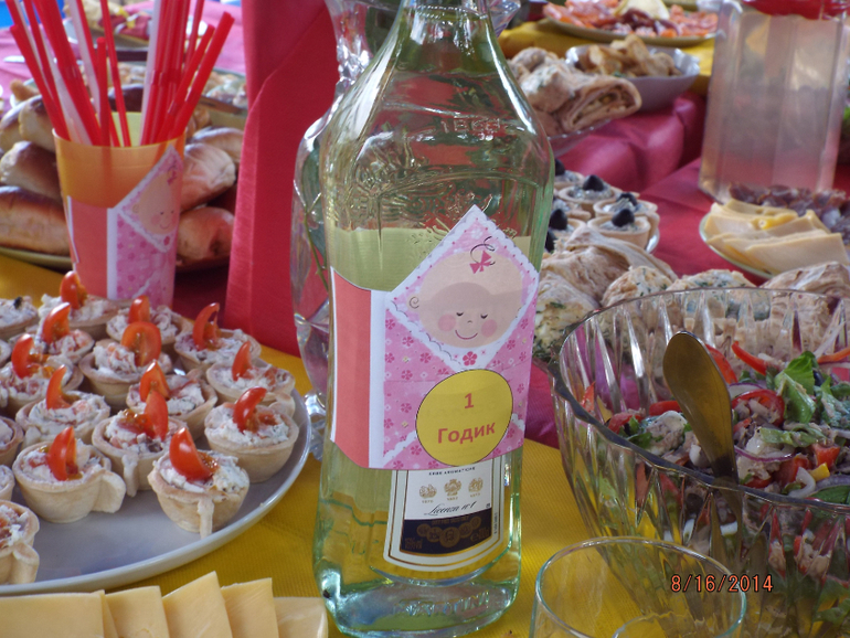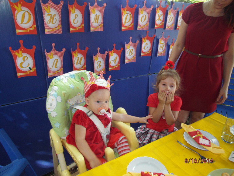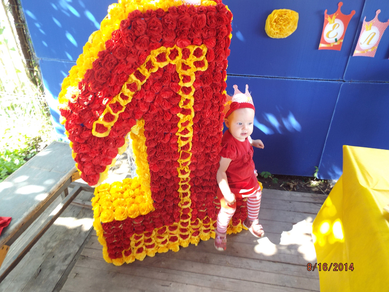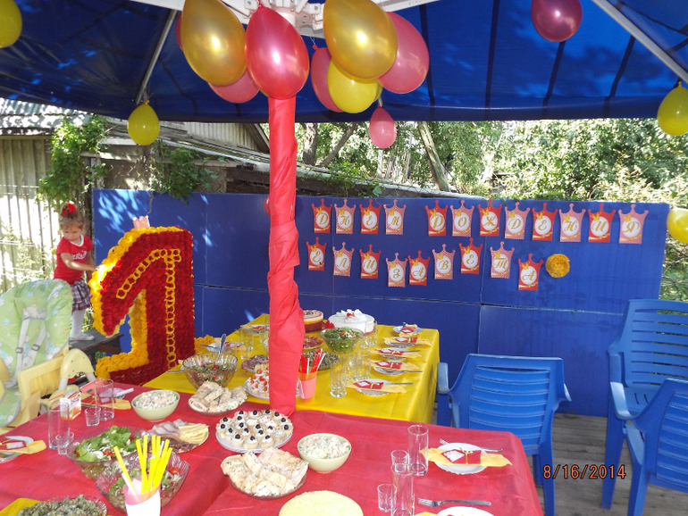 Делали все сами,подключив бабушку папу дядю старшую дочь.Без них бы я не справилась.За три дня сделала единичку.Испекла два торта(хотела один в два яруса,но нехватка времени сделали свое,итого два тортика и капкейки)Заказала у Julianna (все для украшения праздников) растяжку ,корону и плакат на кого похожа.Сделала она быстро.Вешала растяжку по факту ,боялась будет дождь..Сделала салфетки,наклейки на бутылки(нашла в инете)..Сделала несколько конкурсов,чтоб гостям не было скучно..ну и фотки))