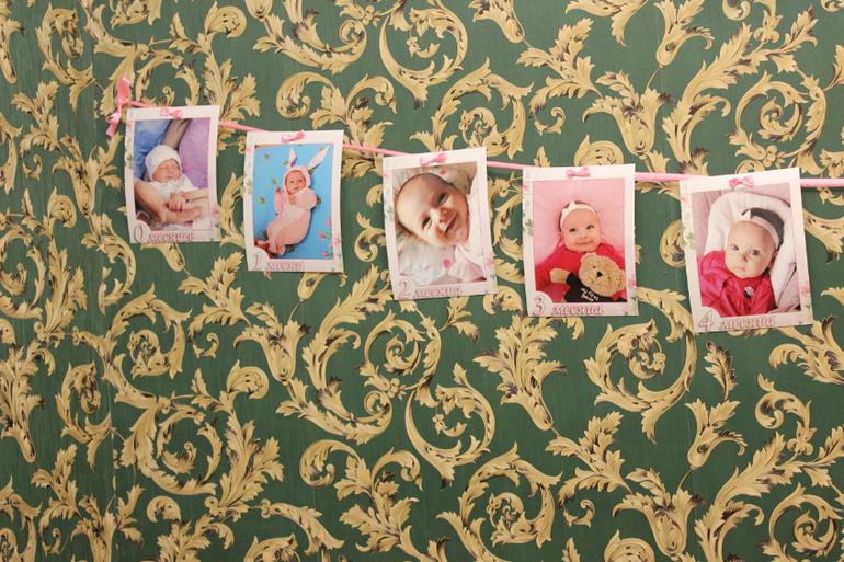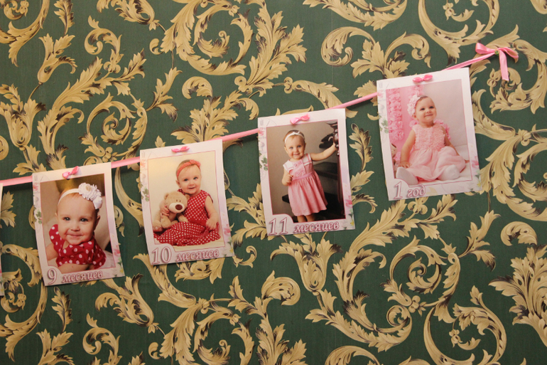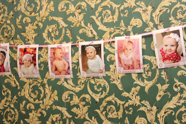 Вот такая гирлянда украшала стену над столом. Все фото, кроме 0 месяцев делала я, можно наблюдать мой прогресс как новоявленного "фотографа"