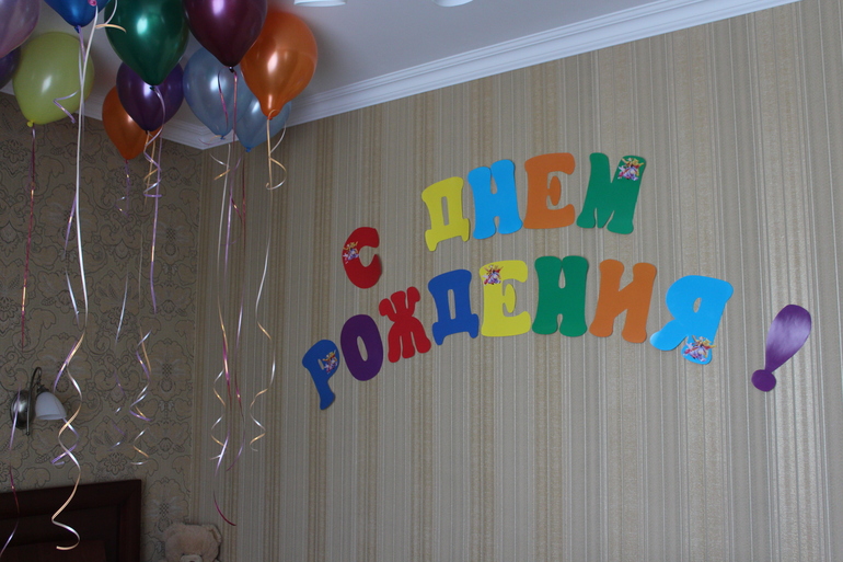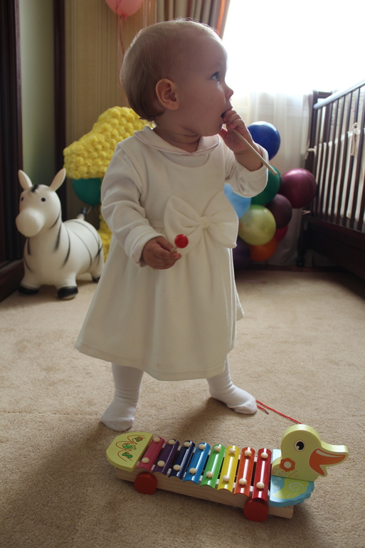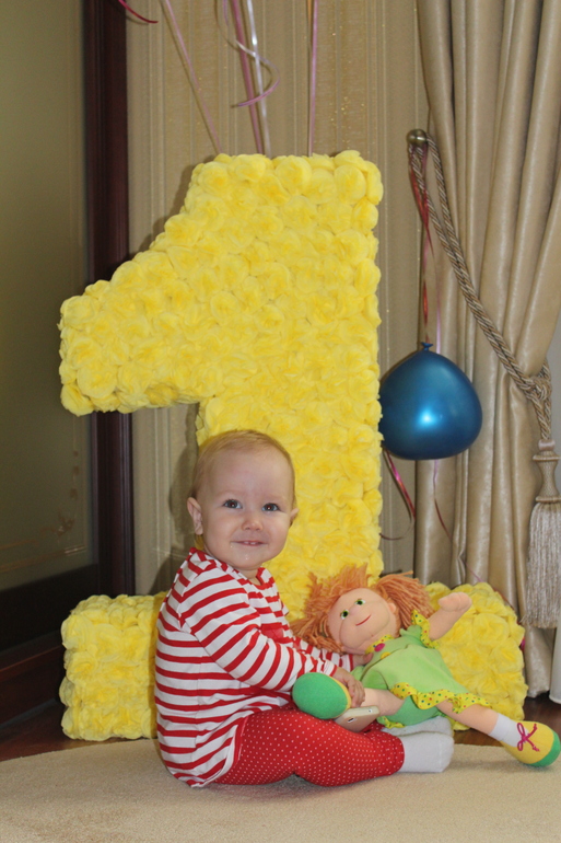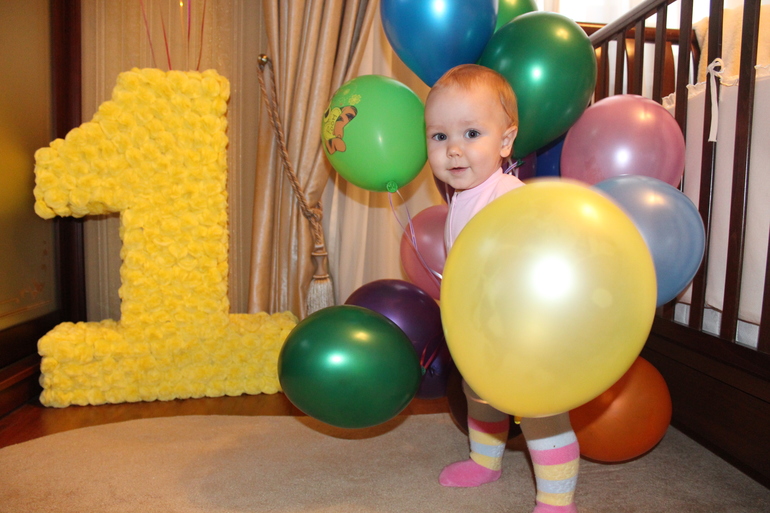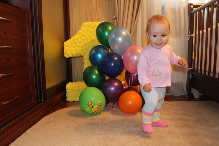 Праздник наш был во вторник. Во вторник нам привезли шарики, во вторник я приклеила на стену "С Днем Рождения", во вторник у нас был праздничный семейный ужин...а вот основной праздник с гостями был перенесен на субботу. За те несколько дней, которые у нас были до субботы мы со Златой успели подружиться с шарами и наиграться подаренными самыми близкими подарками :)