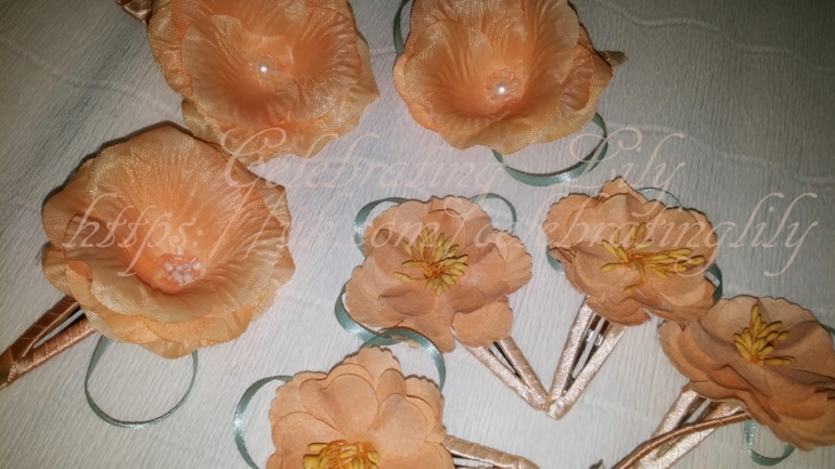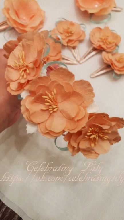 В этом году мне почему-то не захотелось колпачков, я решила выделить гостей аксессуарами) Для мужчин я заказала галстуки-бабочки, а для девушек сделала сама заколочки)