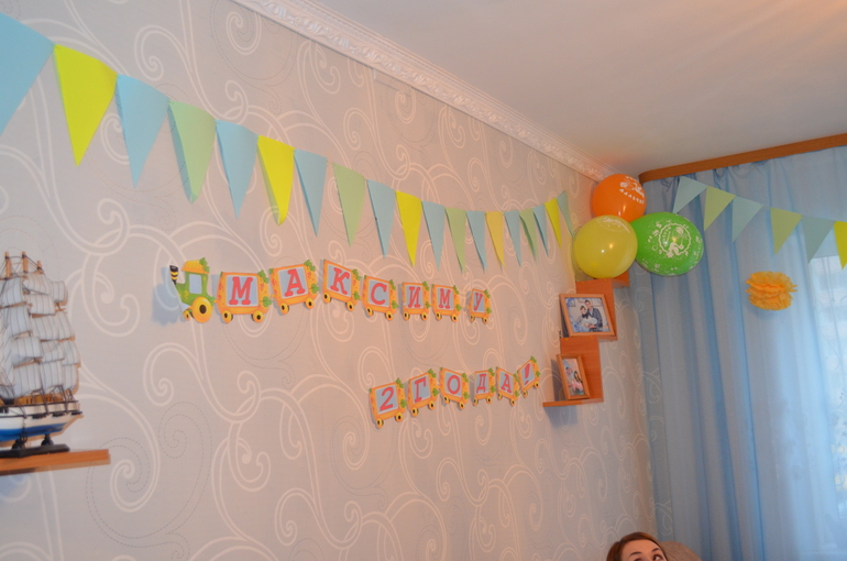 Украсили две комнаты - зал,где был стол, и комнату,где играли детки....шарики,помпоны, гирлянды...