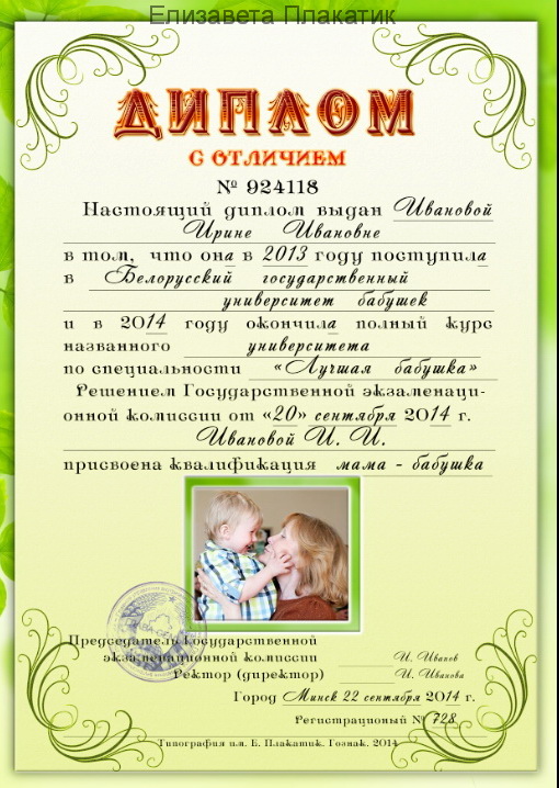 Плакаты "На кого же я похож?", анкеты со смешными вопросами для гостей, грамоты и дипломы бабушкам, доверенности крестным...;