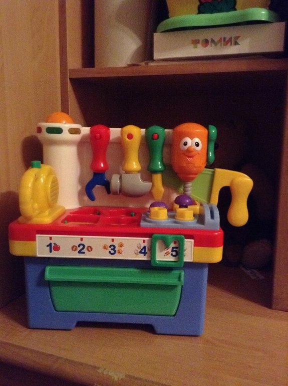 Одна из самых крутых игрушек - это коробка с инструментами kiddieland (вообще, на мой взгляд самая продуманная фирма, производящая игрушки для детей) - чудо какое-то. Столько всяких штучек, звуков, кнопочек. Сортер еще. Можно гвозди забивать. Крутить шурупы, кидать мячик в трубу, пилить пилой, дрель включать. и все это сопровождается звуковыми эффектами, причем не сильно навязчивыми.
