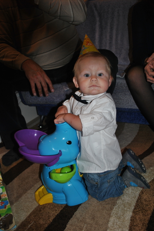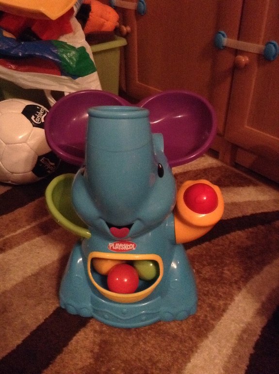 Слон Play Skool. Я не заказывала, но Сашины родители хотели подарить именно его) Ну что я могу сказать, он ... эффектный))) он выдувает шарики из хобота. Тема не очень заинтересован, хотя понимает где шары брать и куда кидать.