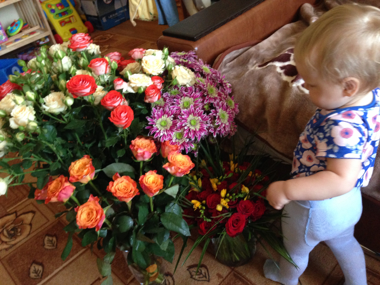 Самым сложным было сфотографировать малышку) Она категорически отказывалась) Начинала капризничать и вырываться) В общем то мне с ней повезло, она очень самостоятельная, любит одна играть. И весь день она пыталась уединиться со своими любимыми книжками) но все ее тискали, а она возмущалась. Но в конце вечера появилось настроение, и именинница вдоволь напелась вместе со всеми Михаила Круга) Кричала тааак, и смеялась) все были в восторге! Немного фото, и наши подарочки))) Было море цветов и шариков!!!)))