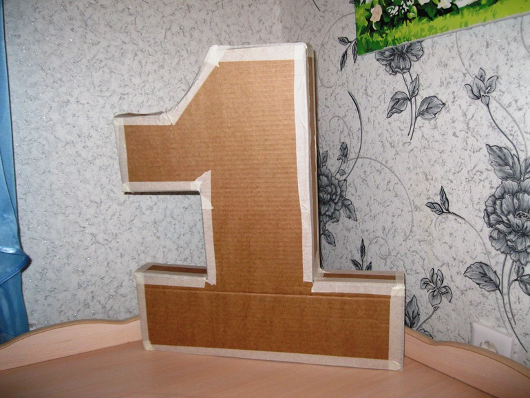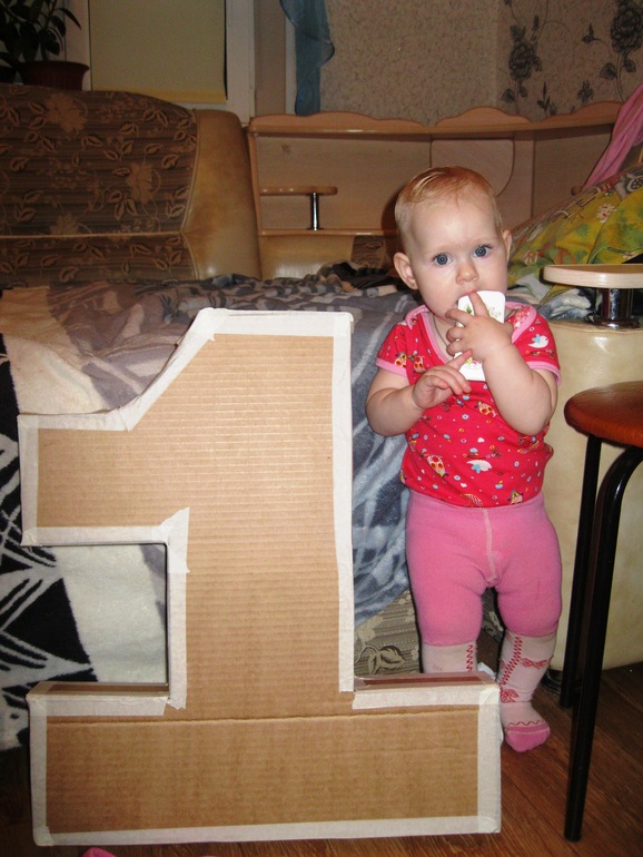 В ход пошла коробка от телевизора..одну часть отмерила-нарисовала..вторую половину просто обвела и вырезали канцелярским ножом.Потом склеили бумажным скотчем.ну и собственно сама единичка