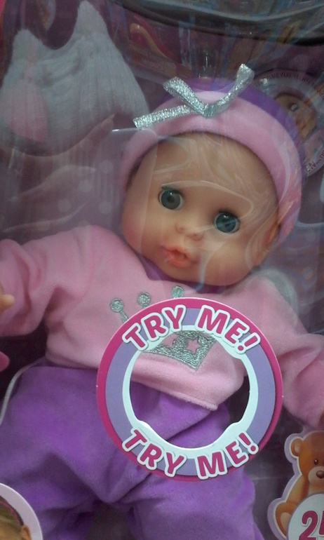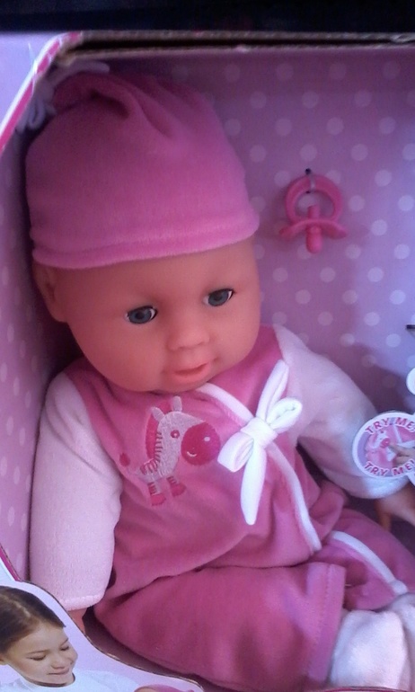 Искала куклу долго — чтобы не говорила, не плакала, симпатичная, с мягким телом..Нашла испанскую. Из всего интерактива толь глаза открывает-закрывает. Размер где-то 30 см.