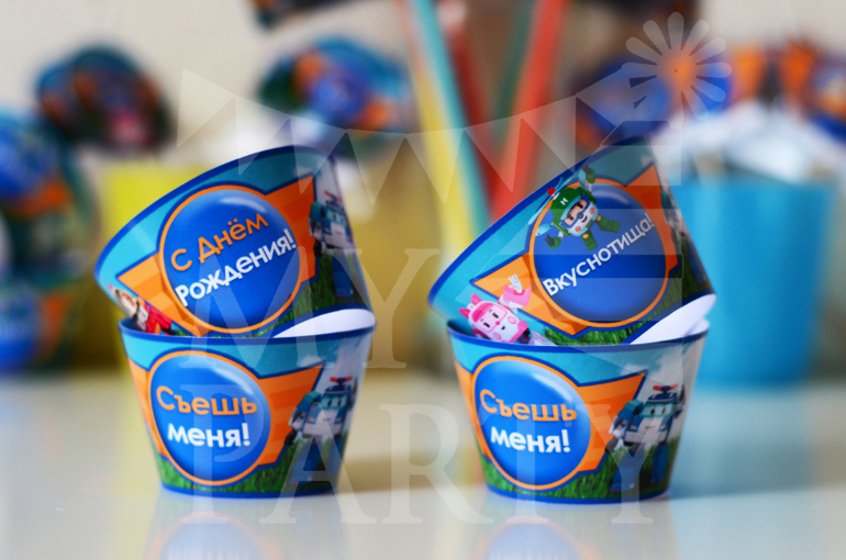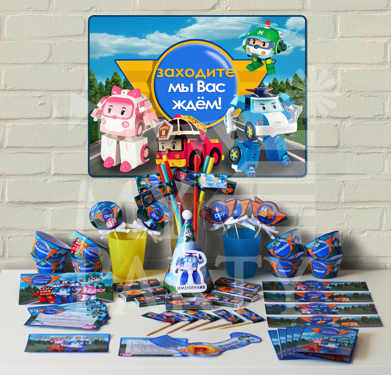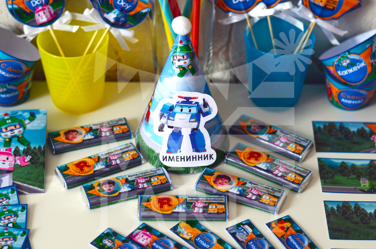 героем поли робокар, итого 16 символов )Пики круглые там же 4 героя, значит 4 видаПики фигурные так же там 4 героя Флажки для канапе Украшения на трубочки б Этикетка на шоколад 20 г Этикетки на шампанское