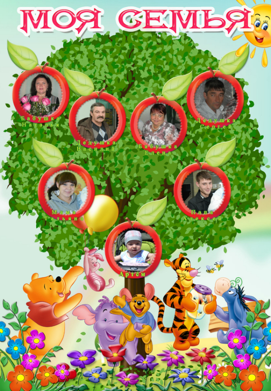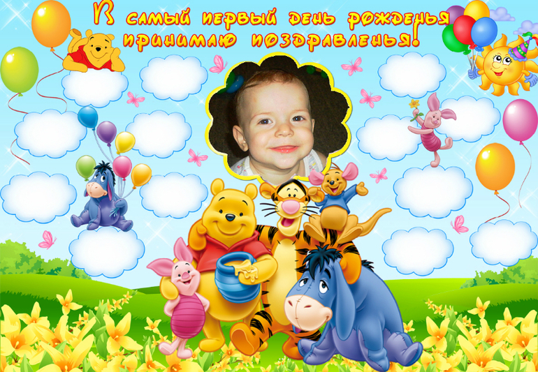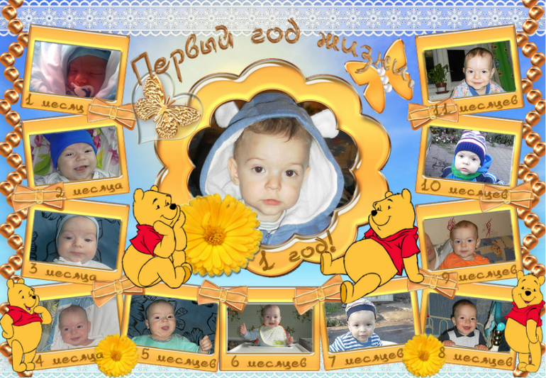 Молодец!!! Все здорово получилось! И Винни Пух))) люблю его!Растяжку сделать легко. На натянутую ленту можно прицепить фото с помощью декоративных прищепок. Либо если не жалко фото, то дыроколом 2 дырочки по краям и туда продеть ленту, на которой будет растяжка.