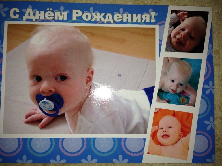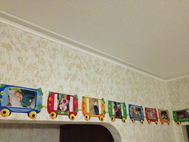 Шаблоны нашла в интернете, распечатала на цветном принтере (13 штук — рождение и 12 месяцев) и уже потом вклеила фото. Советую сделать их не на весь лист, а на половинку (экономия бумаги и краски, и получается не такой большой — у нас на стену не поместился). Фото тоже не продумала — надо было печатать горизонтальные, а вообще можно вставить и одну мордашку.