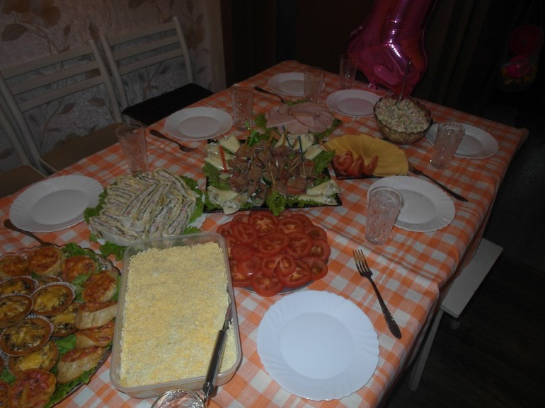 Помидоры и огурчики под грузинской солью,колбасы и сыры,калы с начинкой,улитки с ветчиной и сыром,Тарталетки с жульеном, рулет ( краб.пал,яйцо и зелень)рулетики из хлебцов с слив сыром,огурчик и красная рыбка, помидоры закусочные в соусе( уксус горчица французская и масло)