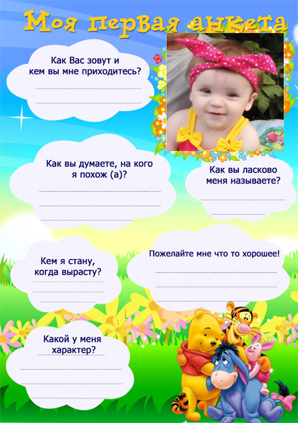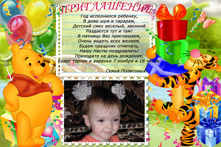 Тортик тоже сама пекла, получился больше 3 кг, о-о-очень вкусный, но НЕКРАСИВЫЙ. Не успела найти пищевые красители, а простые соки отбивались от него. В общем конечно я очень расстроилась. Но гости не оставили даже кусочка! Ели с добавкой, а некоторые и домой попросили. К сожалению не было возможности(финансовой) заказать красивый торт. Все прошло очень весело, хотя я весь день с самого утра вертелась как белка в колесе, очень устала. По своему опыту скажу что не надо много готовить на столы, лучше это время уделить ребенку. Делала ромашку, мысли малыша и конечно же телеграмму. Все анкеты я запечатала в конверт и оставлю до 18-летия Настеньки. Гости остались очень довольны!