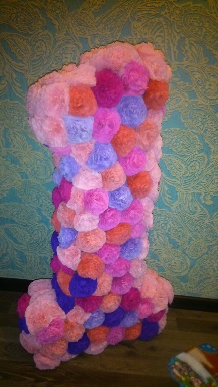 Подготовка к ГодовасиюВысота почти 90 см, ширина основания 47 см. Лицевая сторона цветочки сделаны из гафрированной бумаги, боковые части из салфеток, сзади просто обклеена гафрированной бумагой розового цвета.500 рублей 89047656748