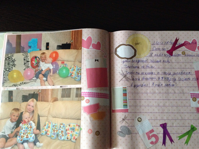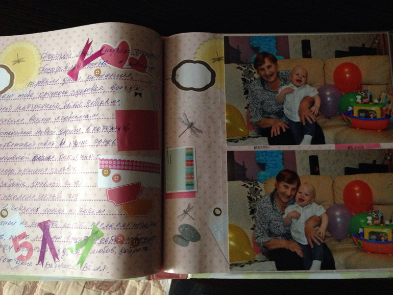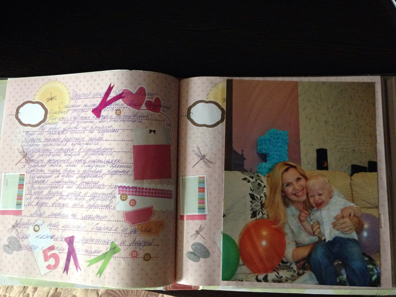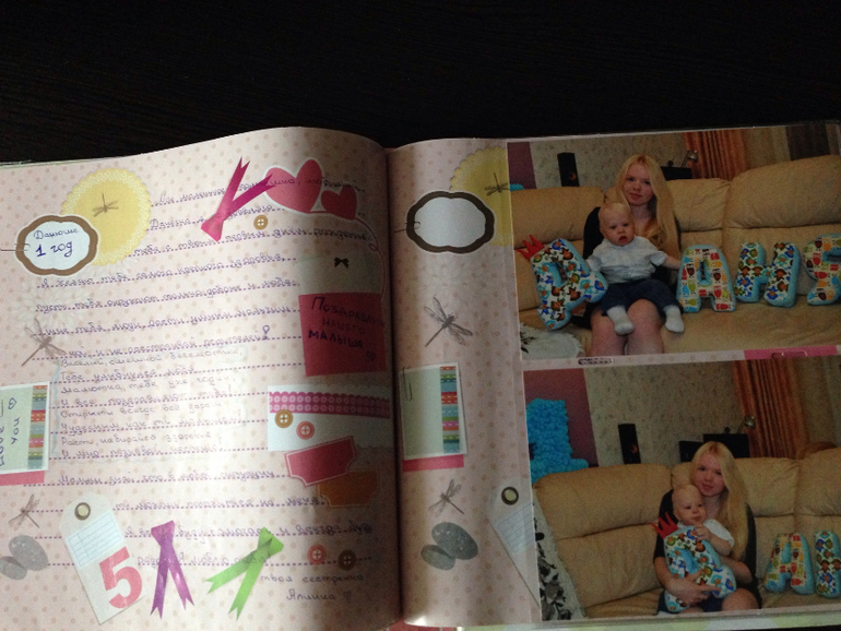 Идеи для вдохновенияДевочки, хочу поделиться одной идеей. Может, кому пригодиться. На празднование годика я решила сделать альбом, в котором рядом с фотографией гостя ( его подарка, или вручения подарка будет его поздравление. Так как идея появилась у меня за пару дней, то я пошла коротким путем и купила подходящий альбом в магазине. А творческим мамам можно и самим нарисовать или приготовить заранее листы для поздравилок, отпечатать. Ну у кого на что хватит фантазии. И несколько фото