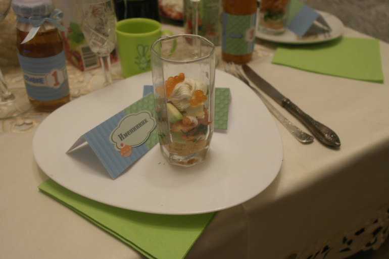 В стаканах я сделала салатик))) Кстати он то само больше всем и понравился! и малышам и всзрослым!!! По слоям: семга слабосоленая (мы сами засаливаем обычно), огурец, креветки, яйца отварные (у меня были перепелиные), помидоры, авокадо, крем-сыр творожный (выдавливала через мешок для крема с насадкой), икра красная. Все слои совсем чуточку прослаивала нежирным майонезом (можно заменить сметаной или крем сыром), и посыпала зеленью через слой. Короче получилось очень вкусно )