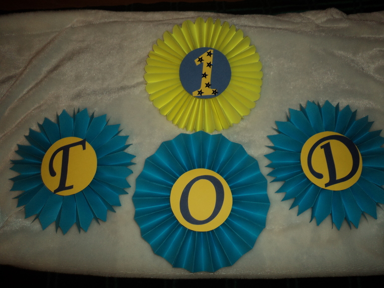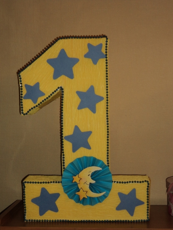 Да, сама...времени в обрез было, когда такая идея мне пришла! А растяжка просто делается — это веерные круги, делаете два веера и склеиваете их между собой. Я потом сверху приклеила круги и на них уже распечатанные буквы и цифру.