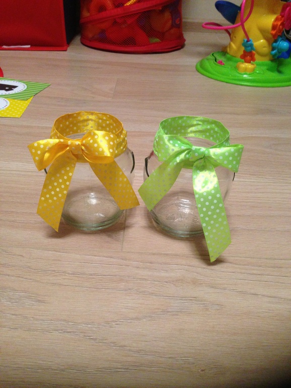 Две баночки декорированные бантами( мы использовали для кейкпопсов)