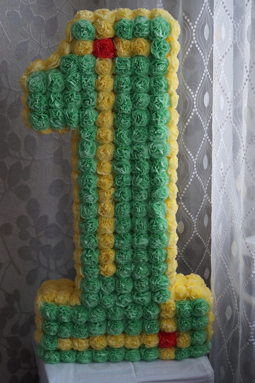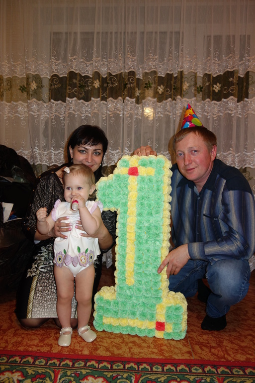 Первый наш на день рождения выпал на воскресенье 18.01. А так как бабушки с дедушками, да и крестные живут далеко, то в этот день мы нашей большойсемьей пошли первый раз кататься на каруселях.А сам праздник решили устроить в субботу 24.01. Непосредственно ко дню рождения из украшений мы успели сделать только единичку и гирлянду "Дарине 1 год". Но вот сфотрографировать дочу с единичкой забыли)))). Решили ну и ладно "оторвёмся" в субботу.