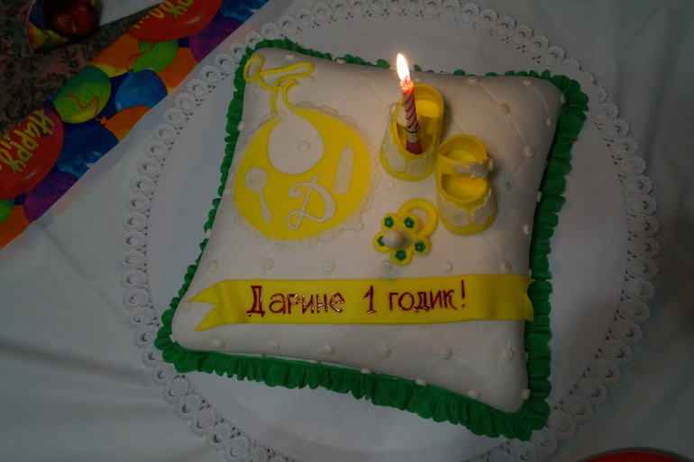 Выезжали мы в субботу в 5 утра и естесственно кое-что из продуктов забыли (в основном готовили бабушки, но я тоже немного приготовила). Пока мы с бабушками "дорезали салаты", мужу пришлось бегать по магазинам за продуктами, шариками и украшать комнату. А одного из дедушек отправили гулять с именинницей, чтобы она лучше выспалась. Гостей было 14 взрослых и 3 детей. Начали собираться в 3, но в итоге начали отмечать только около 5. У меня был подготовлен небольшой сценарий, но мы его особо не придерживались. Провели конкурсы: ромашка, сказки-перевертыши, соскоплюй, телеграмма, верю-не верю. Больше всего развеселили конкурсы соскоплюй и телеграмма. Победителям вручалась шоколадка "Дарёнка")). Еще проводили обряд гадание и крестные срезали первый локон. Где-то через 2,5 часа доча устала и мы положили её спать на часок. После её сна у нас было задувание свечки и чаепитие. Я поняла, что отмечать день рождение ребенку в 1000 раз приятнее, чем себе!