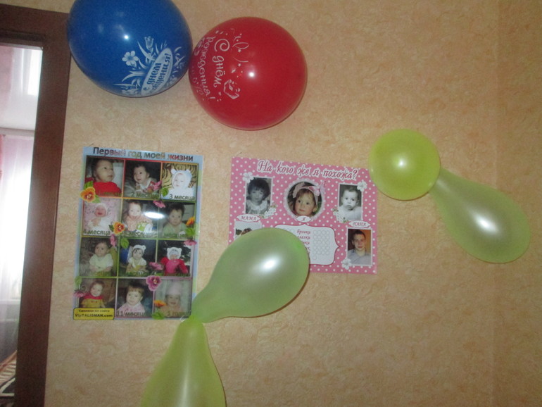 У нас была расстяжка " Лизоньке 1 годик". очень шикарно вышло, все были в восторге, гости нигде до этого не видели). Был плакат " на кого же я похожа")) Выйграл папа с небольшим отрывом!