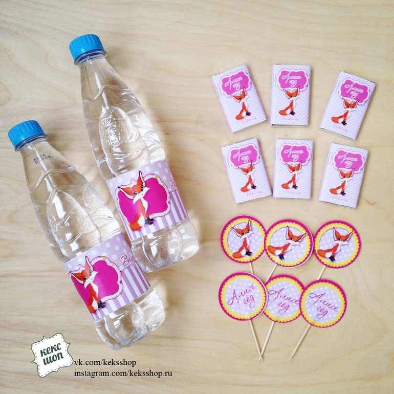 Этикетки на бутылочки, топперы для кексов, обертка шоколада Аленка - все в едином стиле: