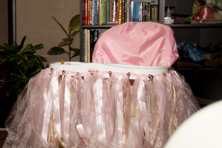 Так-то стульчик у нас ярко-зеленый, сшила чехол на сидение и "юбочку" сделала из фатина и атласных лент.