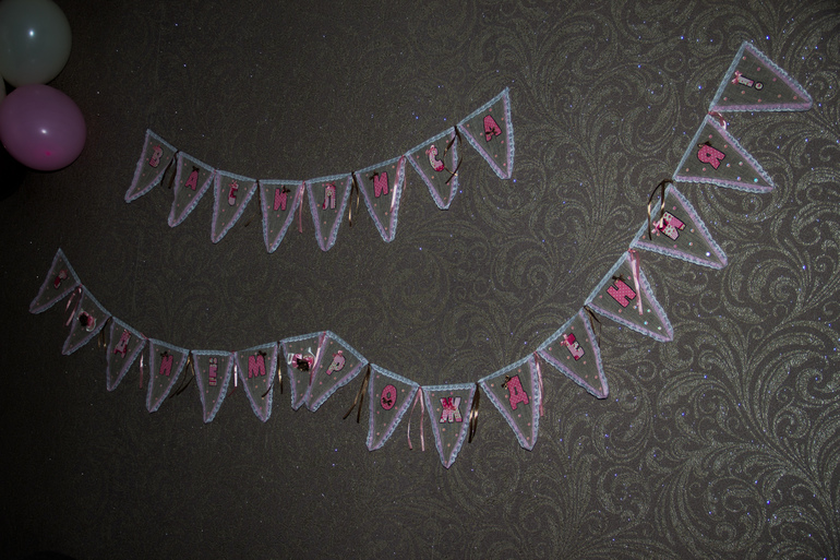 Флажки из ткани, буквы делала методом аппликации с помощью клеевой паутинки, чтобы после вырезания край не осыпался, надпись сделала универсальную, чтобы использовать в будущем: