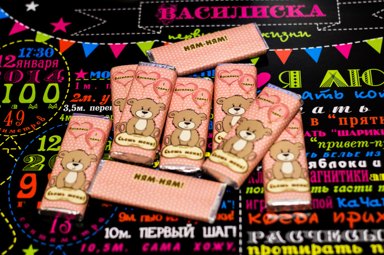 Этикетки на шоколадки тоже делала сама, шоколад раздавали гостям в конце праздника: