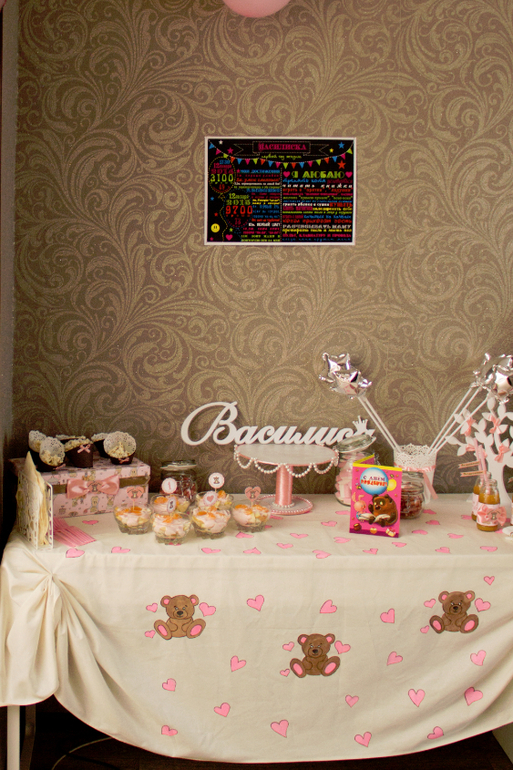 Подставку под пирожные я склепала за вечер, пока пеклись корзиночки (их получилось около 40 шт., треть из которых мы слопали с мужем до дня рождения, так как делала я их за 3 дня, украшала уже в день праздника). Скатерть рисовала на скорую руку под другой стол, пониже и поменьше, но потом решили поставить на другой, чтобы мой ребенок ничего не свернул. Имя и деревце мне вырезали на работе по моим эскизам. Ими я планирую декорировать стены в детской, как только до этого доберусь.