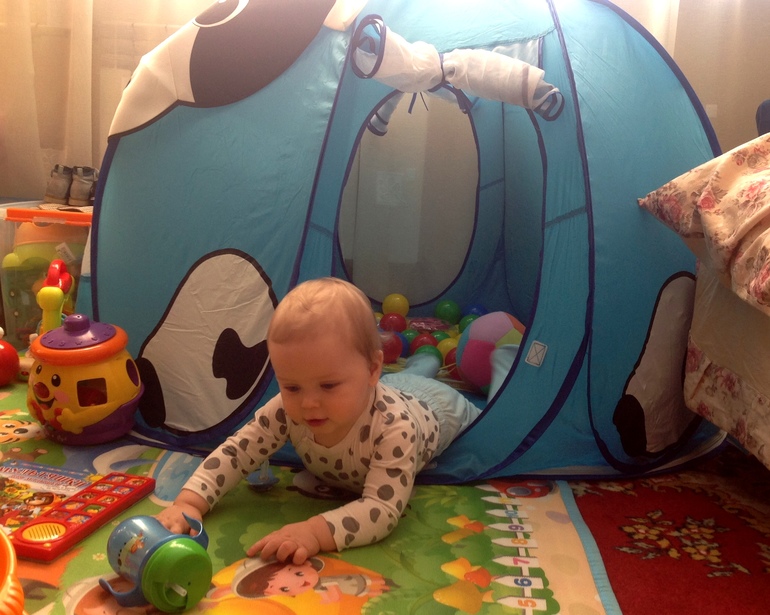 и еще бабушка с дедушкой подарили Максимке вот такую игровую палатку в виде коровы)) ему нравится!)