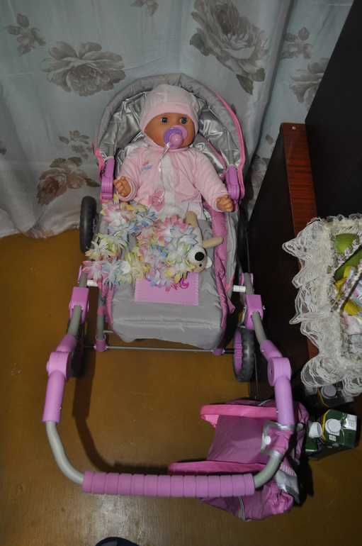 Подарили нам коляску д/куклы, куклу, набор Свинка Пеппа, книги с наклейками, одежда, сандали, деньги.