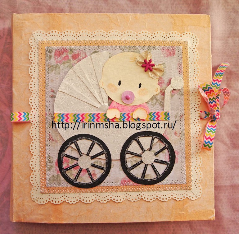 70 страниц разлинованной офисной бумаги для записей о малыше и 30 веселых страниц (15 плотных листов, оформленных скрапбумагой) для фотографий малыша.