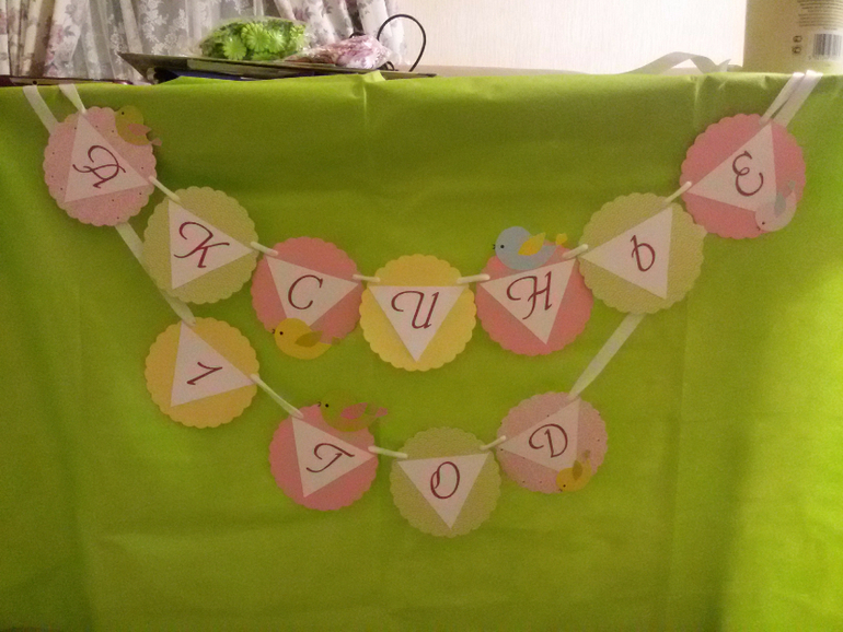 ну и прикинула растяжку,на самом столе будет белая скатерть,а юбка зеленая,еще за кенди баром планирую гирлягду из веерных кругов или просто кругов еще не решила,но и то и то приготовила