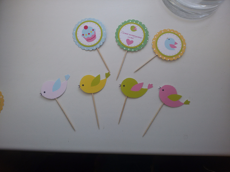 Все делала сама,в том числе и птичек,пироженки рисовала в coraldraw так как ничего нужного мне в векторе не нашла)))полностью ручная работа с нуля)))