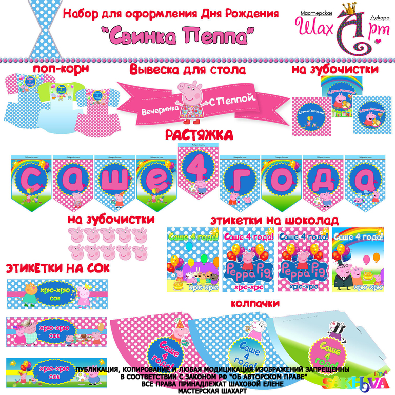 Добрый день. У меня есть 2 варианта оформления в стиле свинка пеппа в розово-голубых тонах и в лилово-желтых. Возможна разработка нового варианта декора, под платье именинницы или под стилистику зала для празднования.