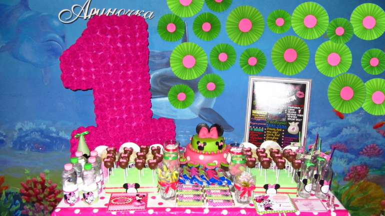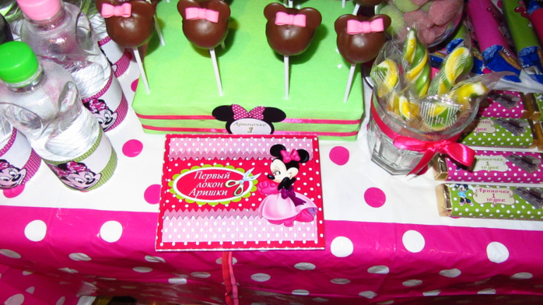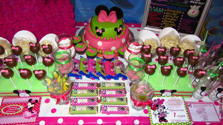 Здорово, нет слов, поздравляем вас. У нас в июле торжество, но я уже тоже в активных подготовках,решила лучше заранее, и тема у нас как у вас Любимая МИННИ, только в красно белых тонах. Молодцы, так красиво и ярко , мне ваш праздник очень понравился.