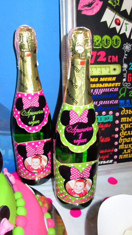 Здравствуйте скажите пожалуйста ,а как вы сделали этикетки на бутылки шампанского ?у нас скоро тоже др в стиле Мини маус )подьираю всю атрибутику .очень интересно !У вас очень красиво все получилось !!