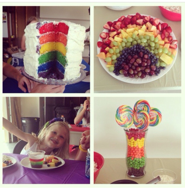 Cупер!Можно вырезать украшения из цветной бумаги,ту же радугу,шары с фото ребенка — дешего.))Вместо торта пирог фруктовый с сюрпризом — внутри разноцветные драже....