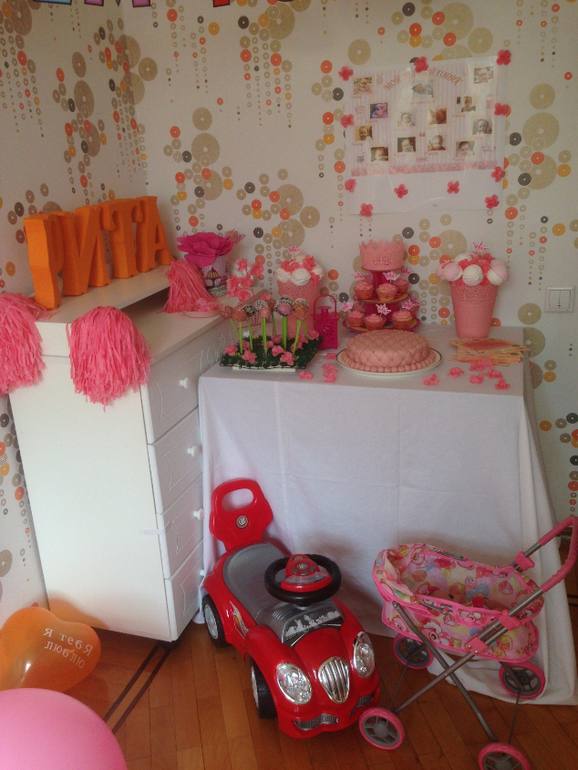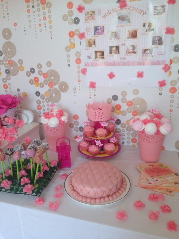 Задача была организовать фотозону и сладкий стол. Буквы из пеноплекса были сделаны мужем еще месяц назад для того, чтобы их повесить в детской комнате. Я сделала композиции из зефира, распечатали коллаж первого годика, сделала деревце с розовыми цветочками, импровизированную травку,на которой выросли кейкпопсы))))