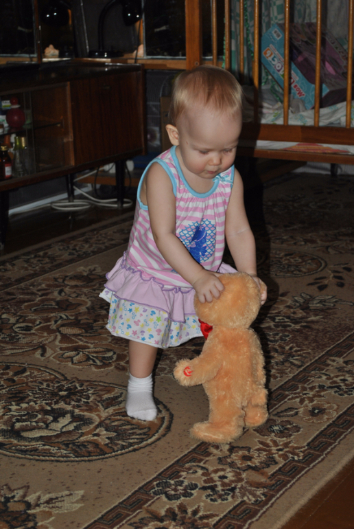 Но позже, когда все поздравления прозвучали, Марианна освоилась и играла с любимым мишкой) На интерьер не обращайте внимания, праздновали мы у моей бабушки)
