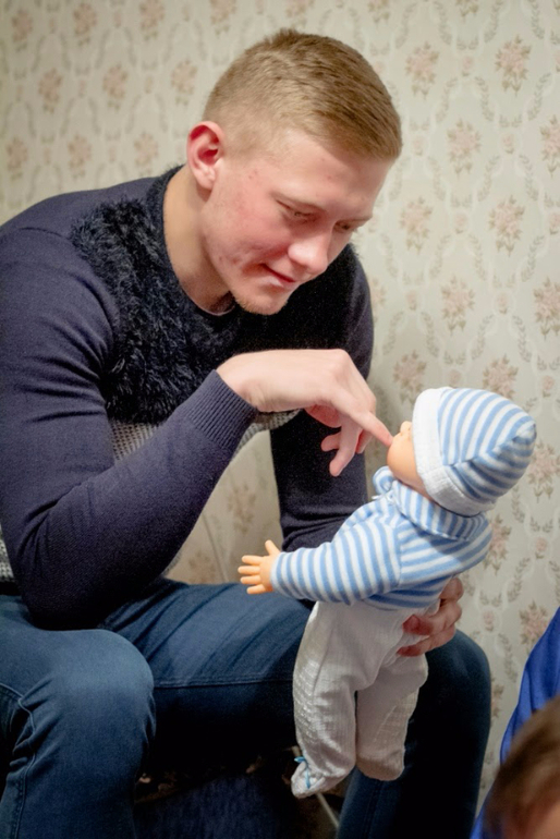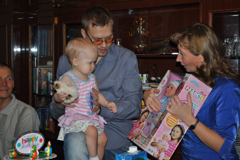 Бабушка дарит интерактивную куклу, Машуля все так же недоверчиво смотрит))
