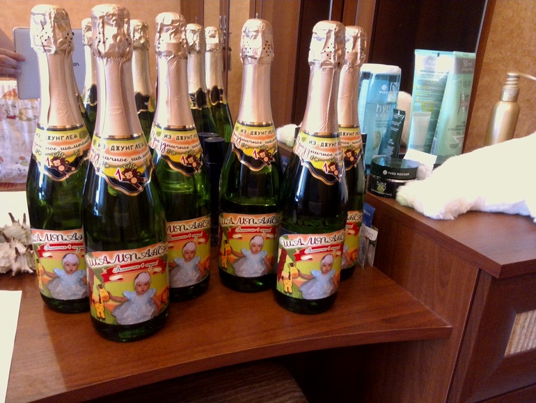 Еще я накрутила веерных вертушек, у меня была единичка и повесила на шторы обезьянок и жирафов, которых тоже делала сама. Алиса встретила гостей, все сели, выпили шампанского именного
