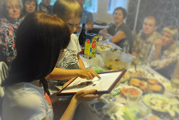 Мое любимое творческое...вот такая картинка передавлась по кругу с красками и салфетками для очистки рук)каждый оставлял свой след)(с дочкой делали дерево и гости оставляли отпечатки в виде листвы)