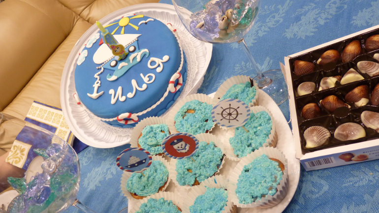 Конечно идей было много: и фон сделать с чайками и облачками, и побольше морских аксессуаров, но времени хватило на то что хватило. Я в целом довольна, сын судя по улыбкам, которые он дарил целый день - тоже. Сделала только 2 вывода: мне нужен новый фотоаппарат и в детский день рождения надо подстраивать по времени под ребенка и не надо его перенасыщать всем, а то под конец Илья немного устал и ему было не до небесных фонариков.