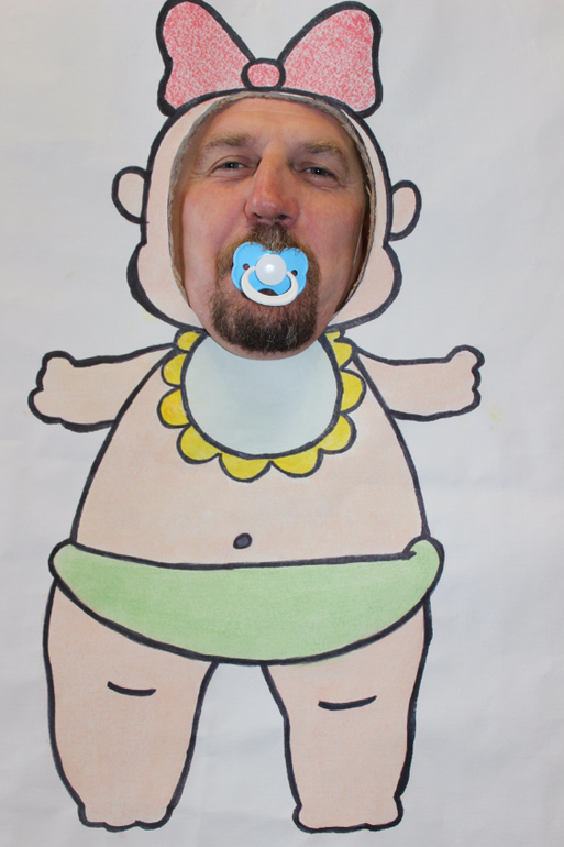 3) Рамка (чтобы было куда руки деть, когда фоткаешься)) - купила в магазе рамку 60х80, обернула ленточкой, украсила. Нарисовала пупса с дыркой для головы (тут промахнулась с размером - великовата оказалась)).
