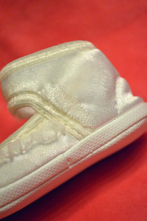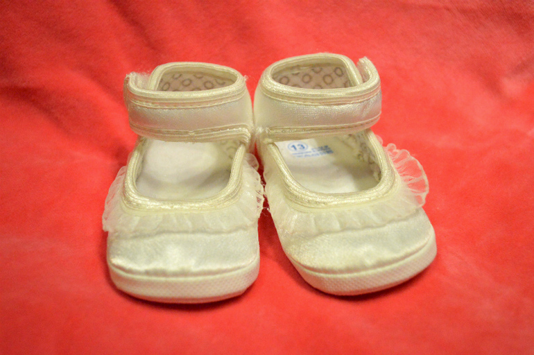 3) Туфельки-балетки белые атласные, стелька 12,5 см, до 18 месяцев где то. Есть дефект
