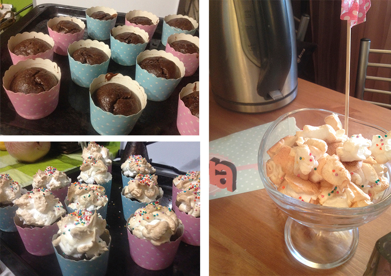 Насчет сладкого стола: рецепт капкейков достаточно прост, а шапочка-меренга хоть и не до конца затвердела, получилось вполне неплохо. Пены вышло так много, что из остатков мы сделали безе.