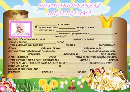 Подготовка к ГодовасиюОчень интересная идея для детского Дня Рождения - шуточная "Поздравительная телеграмма". Правила игры просты: ведущий берет телеграмму и просит каждого гостя назвать первое пришедшее на ум прилагательное. Затем все прилагательные вписываются в пустые строчки телеграммы и зачитываются гостям! Несомненно веселье и смех обеспечены на Вашем празднике! Обязательно сохраните эту телеграмму и Ваш ребенок спустя много лет будет радостно смеяться, перечитывая ее! Вы можете заказать шуточную "Поздравительную телеграмму" с любыми персонажами и индивидуальным текстом с именами Ваших друзей и родственников. Устройте праздник своему ребенку и гостям!