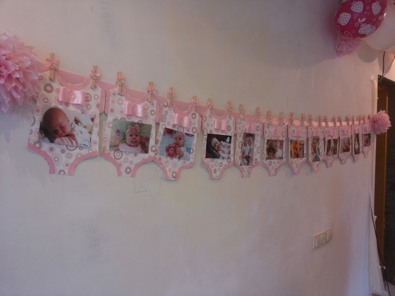 Я делала на обычном картоне А4, а сверху наклеивала обои, т.к не нашла красивого цветного картона в одном цвете. Больше фомат брать не стоит, т.к. двенадцать бодиков и так занимают много места. Фотографии 10*15. На стену крепили ленту на саморезы. Бодики вешала на ленту на деревянные прищепки. На каждой прищепке бантик из ленточки. По краям ленты помпоны из салфеток, закрыли ими саморезы.