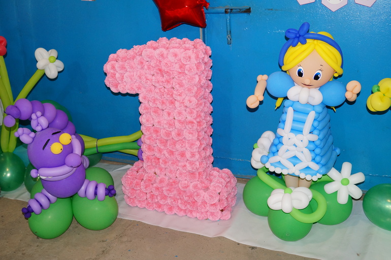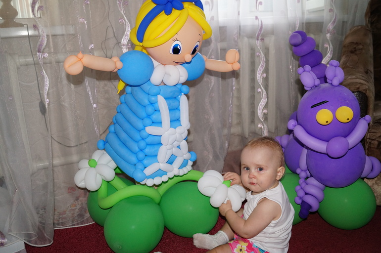 В итоге композиция для фотосессии вышла такая.Никто не ушел без фото на этом фоне)))даже самые взрослые гости хотели иметь фото с надувной и настоящей Алисой)))